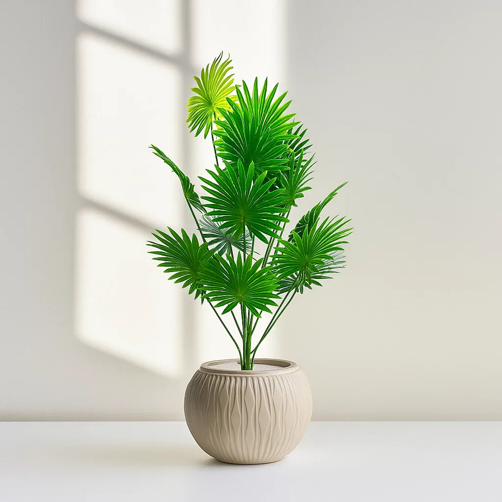 نبات صناعي أنيق من نخيل المروحة يتميز بأوراق خضراء نابضة بالحياة، موضوع في أصيص بيج أنيق بملمس محفور، مثالي للمساحات الداخلية العصرية.