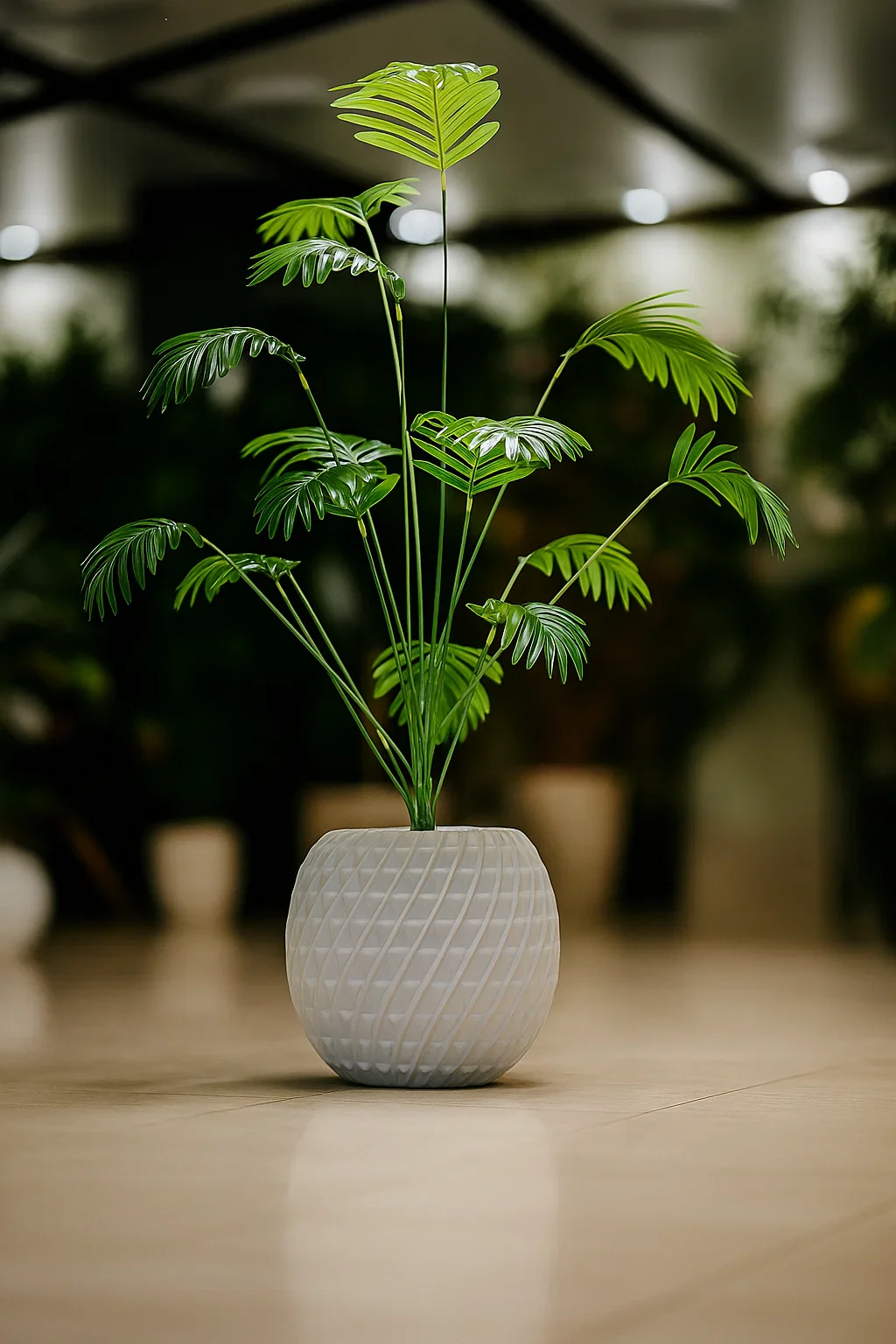 نبات صناعي يشبه النخيل بأوراق طبيعية المظهر في أصيص رمادي بملمس أنيق، يضيف لمسة من الخضرة الاستوائية لأي مكان.