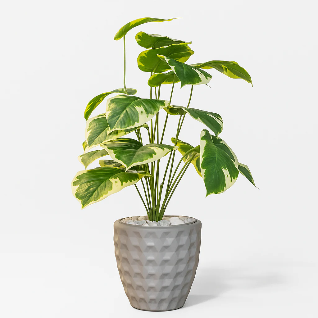 ارتقِ بمساحتك مع نبتة المونستيرا الاصطناعية المرقطة، بأوراق خضراء وكريمية مورقة، مزروعة في أصيص رمادي أنيق بملمس هندسي، لتضفي لمسة عصرية سهلة على الديكور.