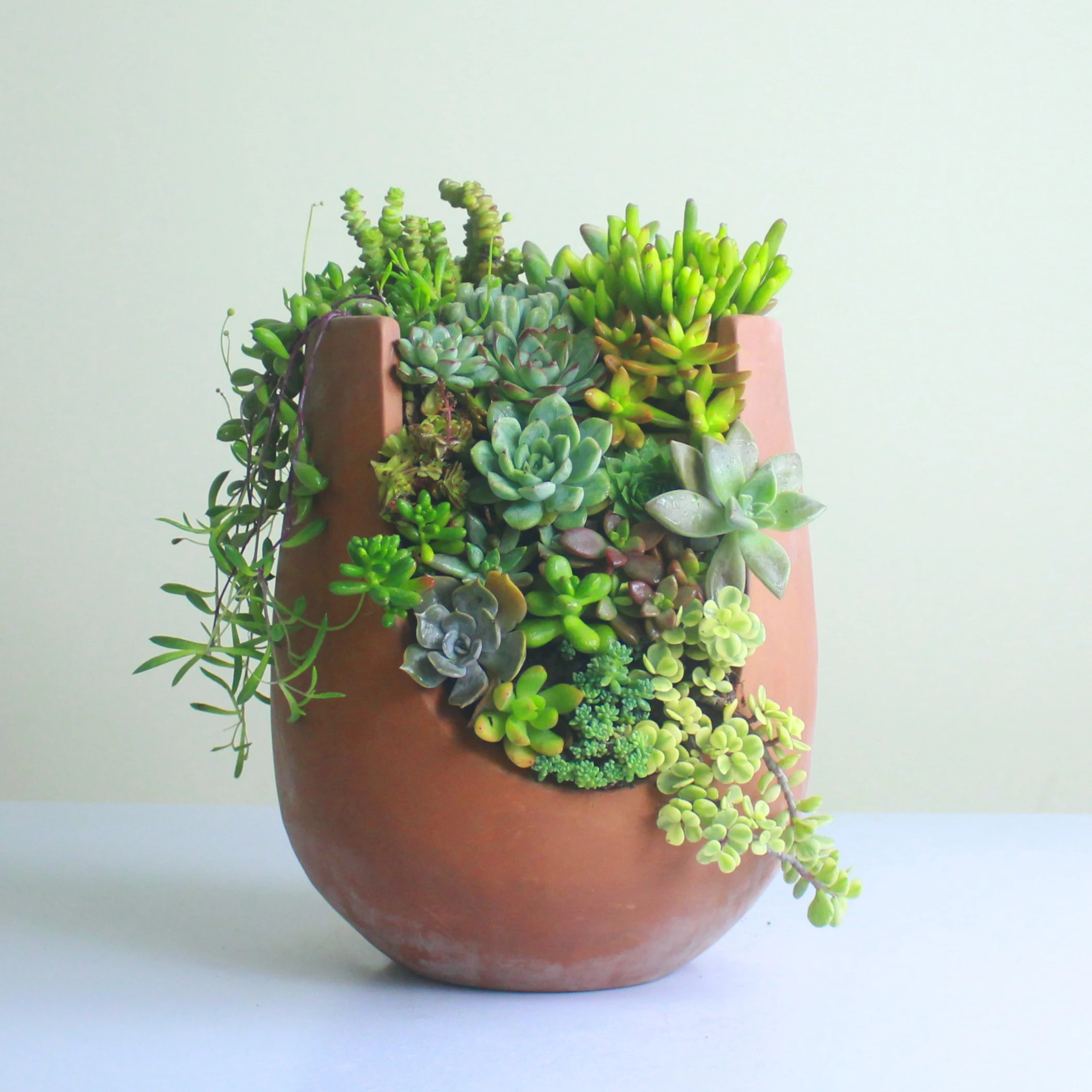 a captivating assortment of vibrant succulents stacked and cascading beautifully in a unique clay pot, this garden thrives in bright sunlight with minimal water. allow the soil to dry out completely between waterings. perfect for sunny windowsills and outdoor areas, it adds a desert-inspired touch with low maintenance.