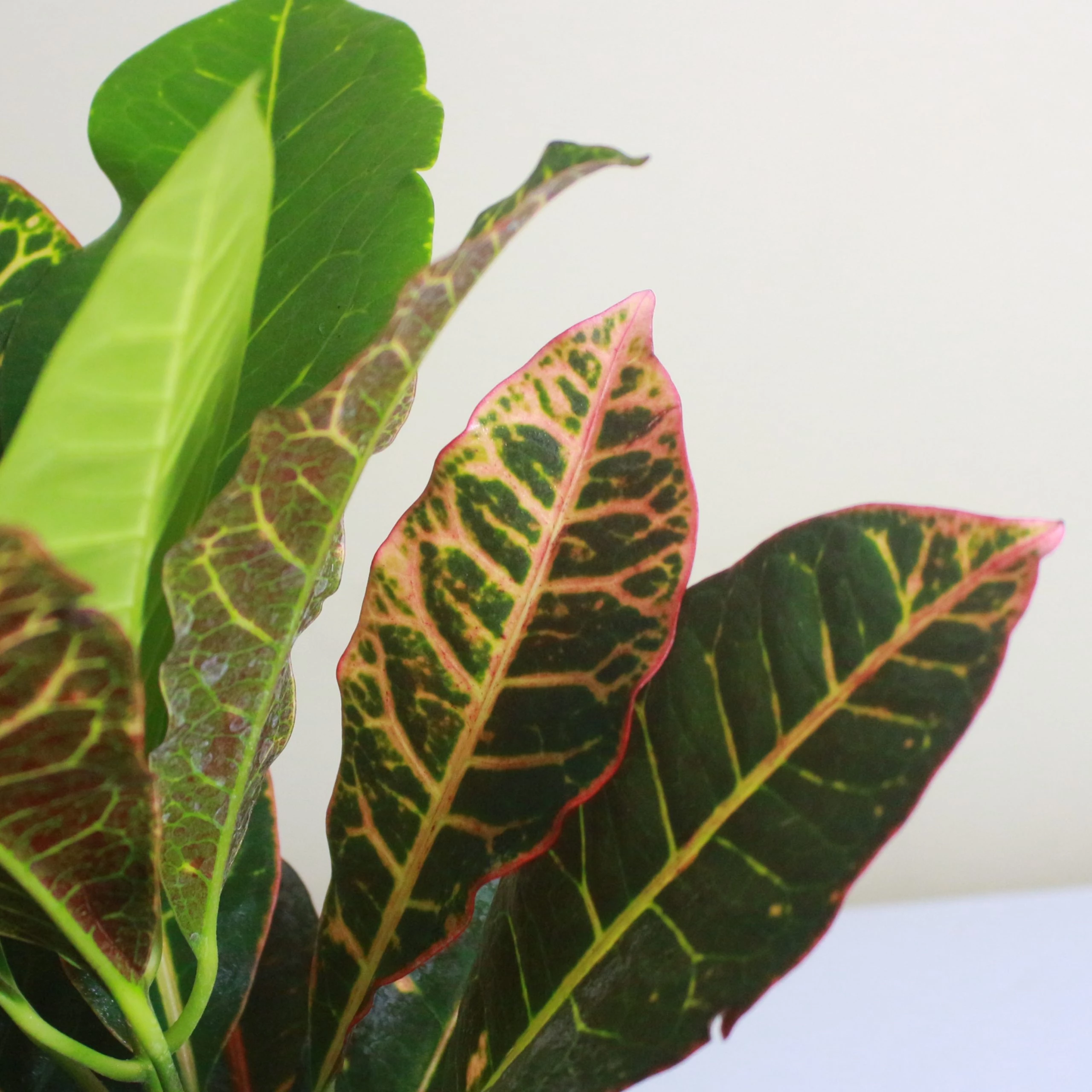 نبتة Croton من فسيلة نبات ورقي ملون جدًا؛ أوراقها فيها درجات أخضر، أصفر، برتقالي وأحيانًا أحمر، تعطي طابع ديناميكي وحيوي.