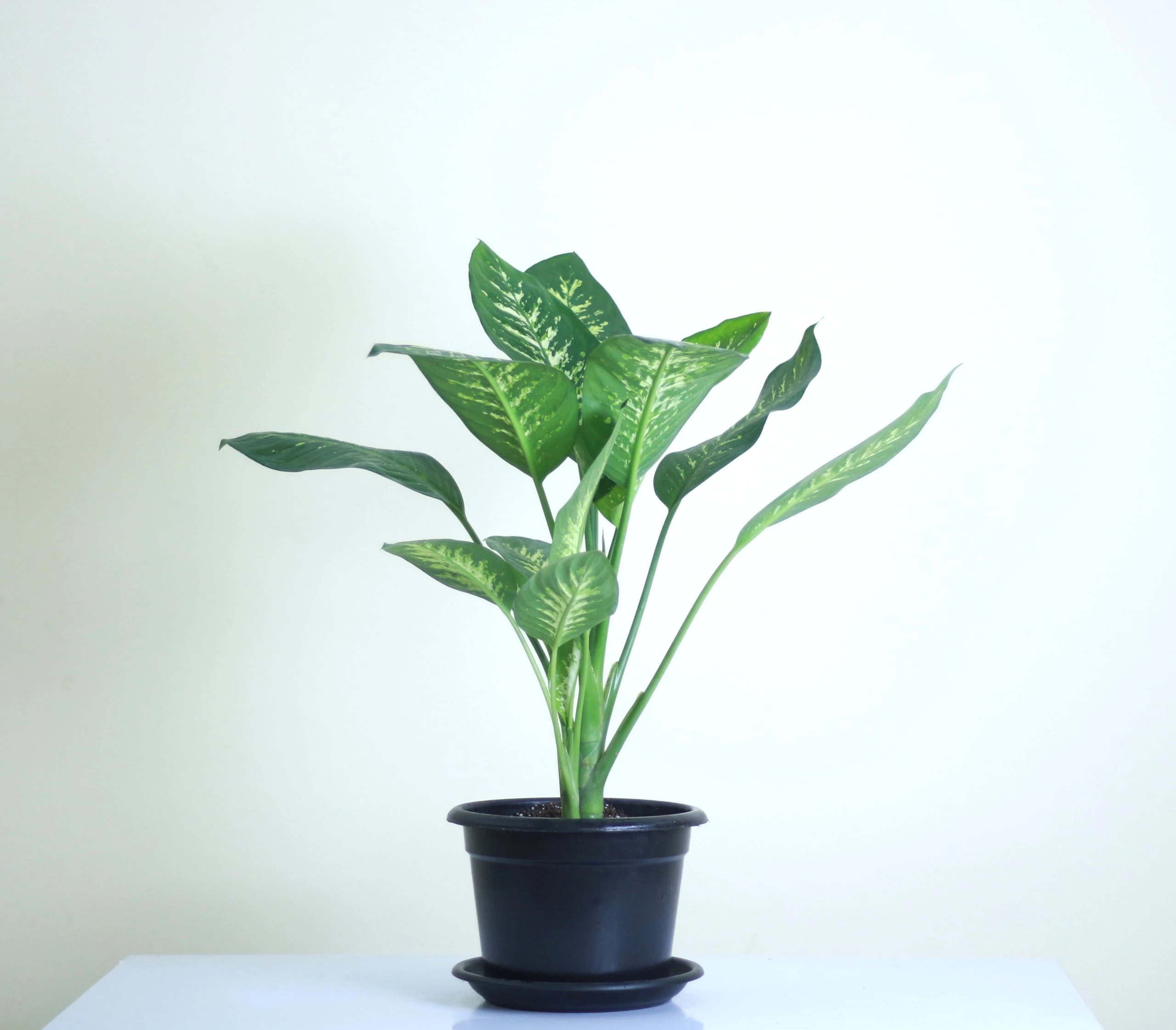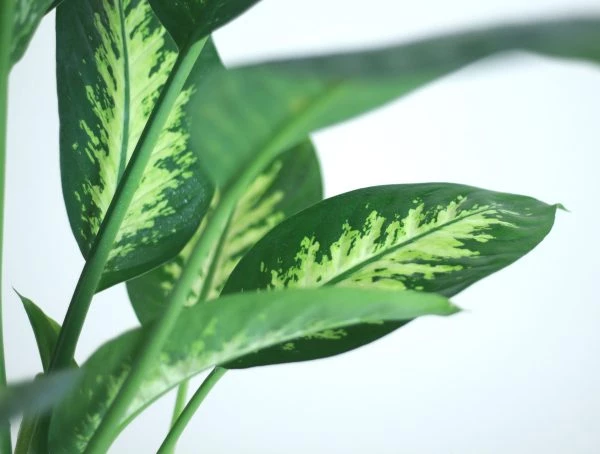 Dieffenbachia Tropic Snow features large, patterned leaves with white spots and stripes. It’s a stylish indoor plant that prefers medium light and moderate watering.