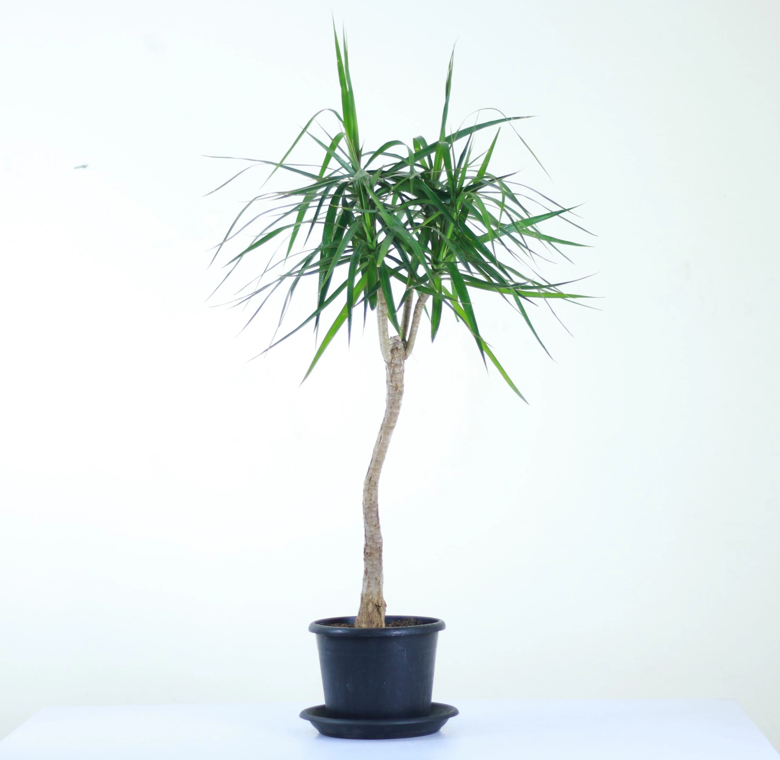 leaves of the dragon tree are long, linear, narrow and attached to the stem without a stalk. they are 61cm long and 1.5cm wide. they are deep, glossy green with red edges along the margins. flowers are fragrant, small, produced on stalks at the ends of the stems and followed by yellow-orange berries.