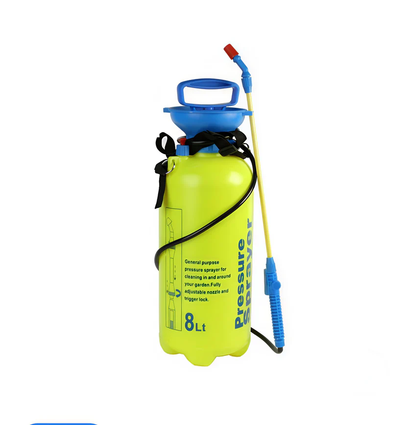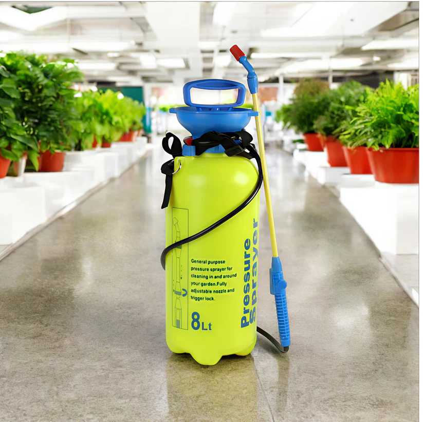 رشاشة ضغط يدوية بسعة 8 لتر مع فوهة قابلة للتعديل، خرطوم مرن، وصمام أمان. مناسبة للاستخدام في الحدائق والمزارع الصغيرة لري النباتات، رش المبيدات والأسمدة، والتنظيف.