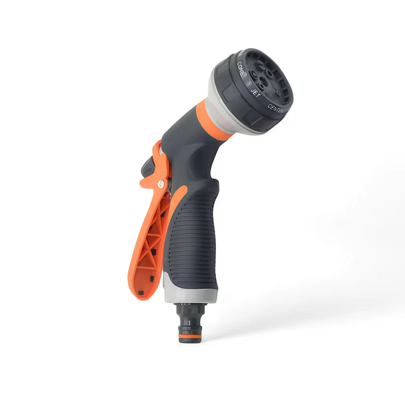 مسدس مياه عالي الجودة مع قبضة مريحة، يوفر 9 أوضاع مختلفة للرش لتلبية جميع احتياجات الري، غسيل السيارات، تنظيف الأرضيات، والعناية بالأحواض والزهور.