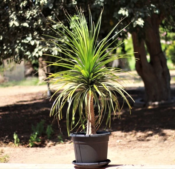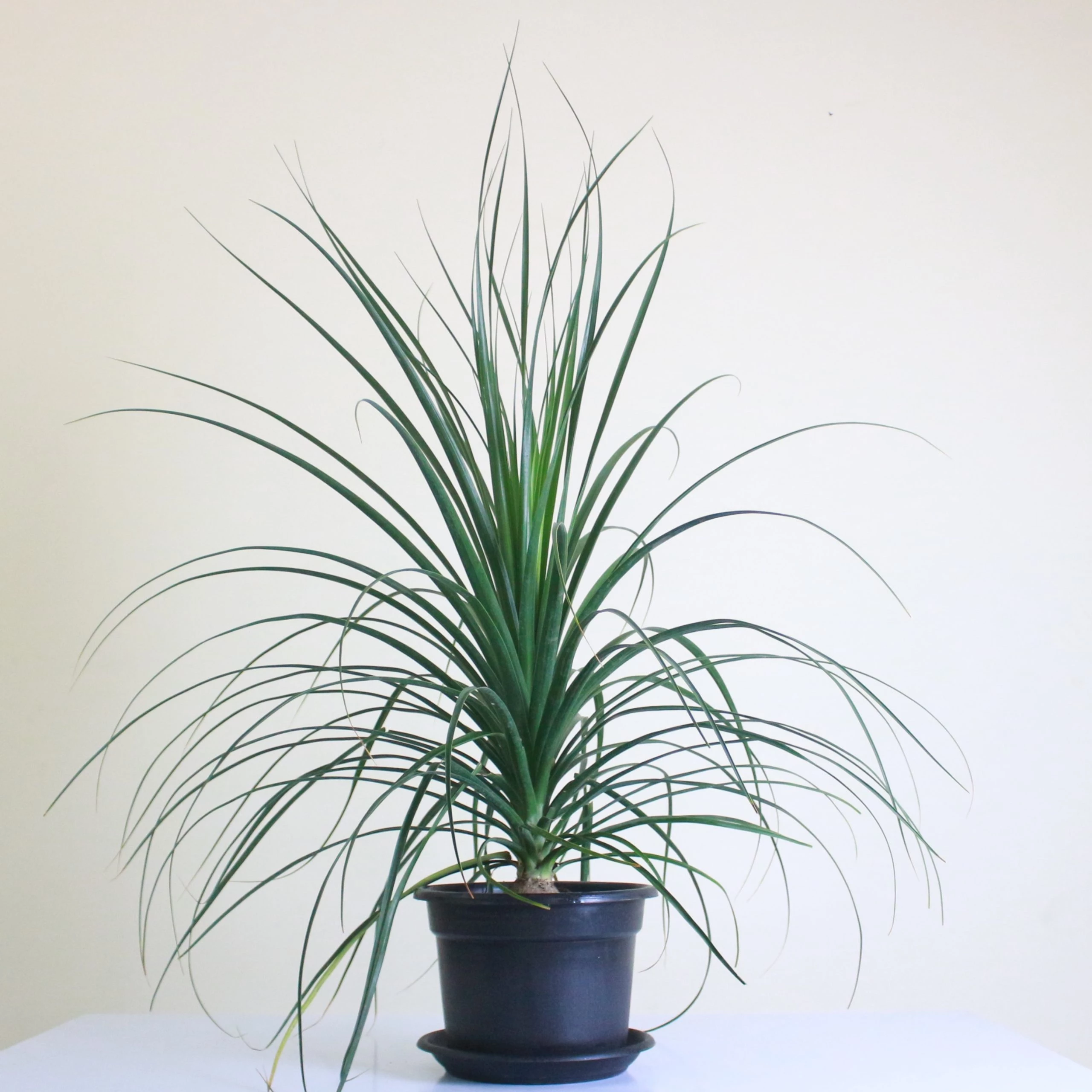 ponytail palm is a tall, palm-like plant that is not a true palm but is closely related to agave. it has an upright, fleshy, trunk-like stem that becomes swollen at the base, where it stores water. this is topped with clusters of long, curved, sword-shaped leaves that hang down giving the appearance of a pony's tail. when mature, it produces panicles of fragrant cream colored flowers that are pollinated by bats.