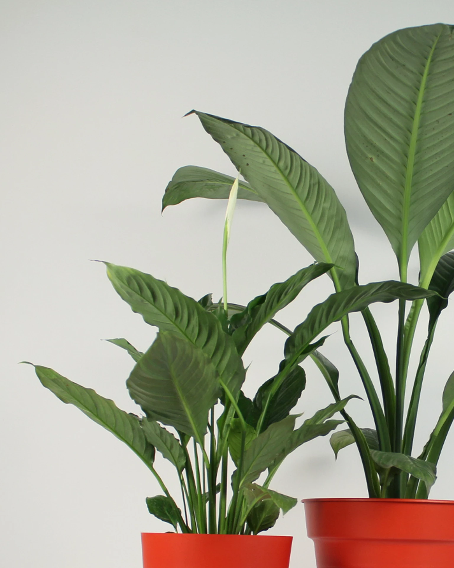 this set includes both the queen lily and peace lily pre-potted in red mintra pots