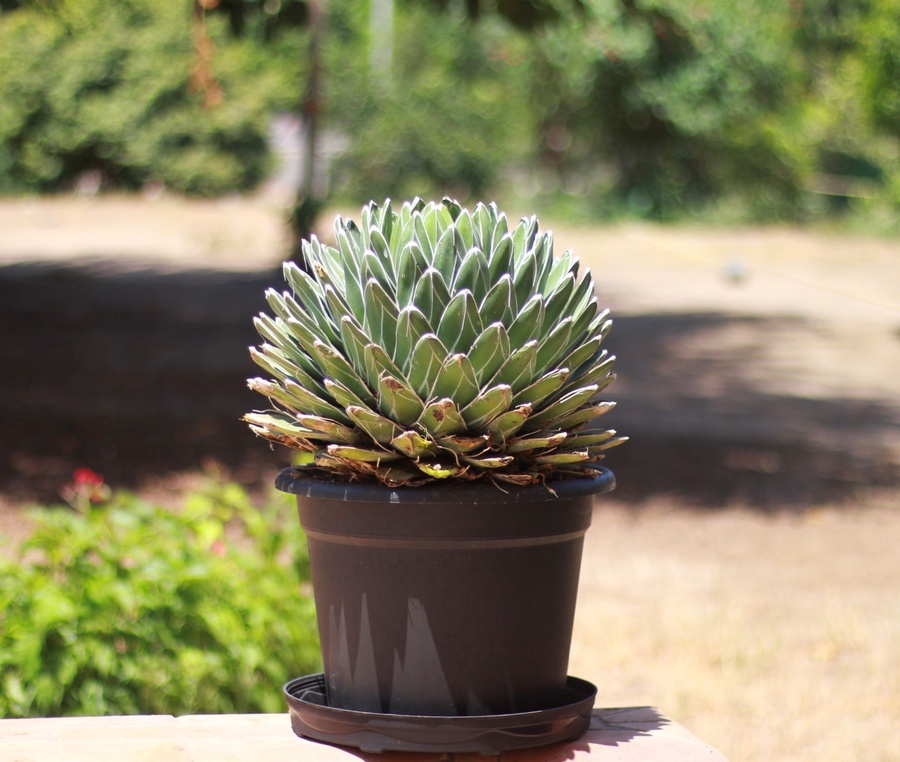 also known as royal agave, this plant is a small species of succulent flowering perennial plant, noted for its streaks of white on sculptured geometrical leaves, and popular as an ornamental