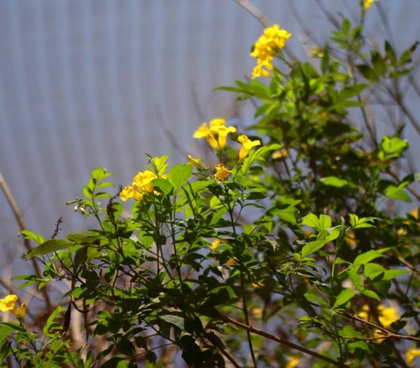 yellow elder is a semi-evergreen small tree. it has bright green opposite leaves. the sunshine yellow flowers are trumpet-shaped. they hang in showy clusters at the branch tips. the blooms appear in flushes throughout the growing season. used in mixed plantations mainly with evergreen where the yellow flowers contrast with the dark green leaves of the evergreen plants.